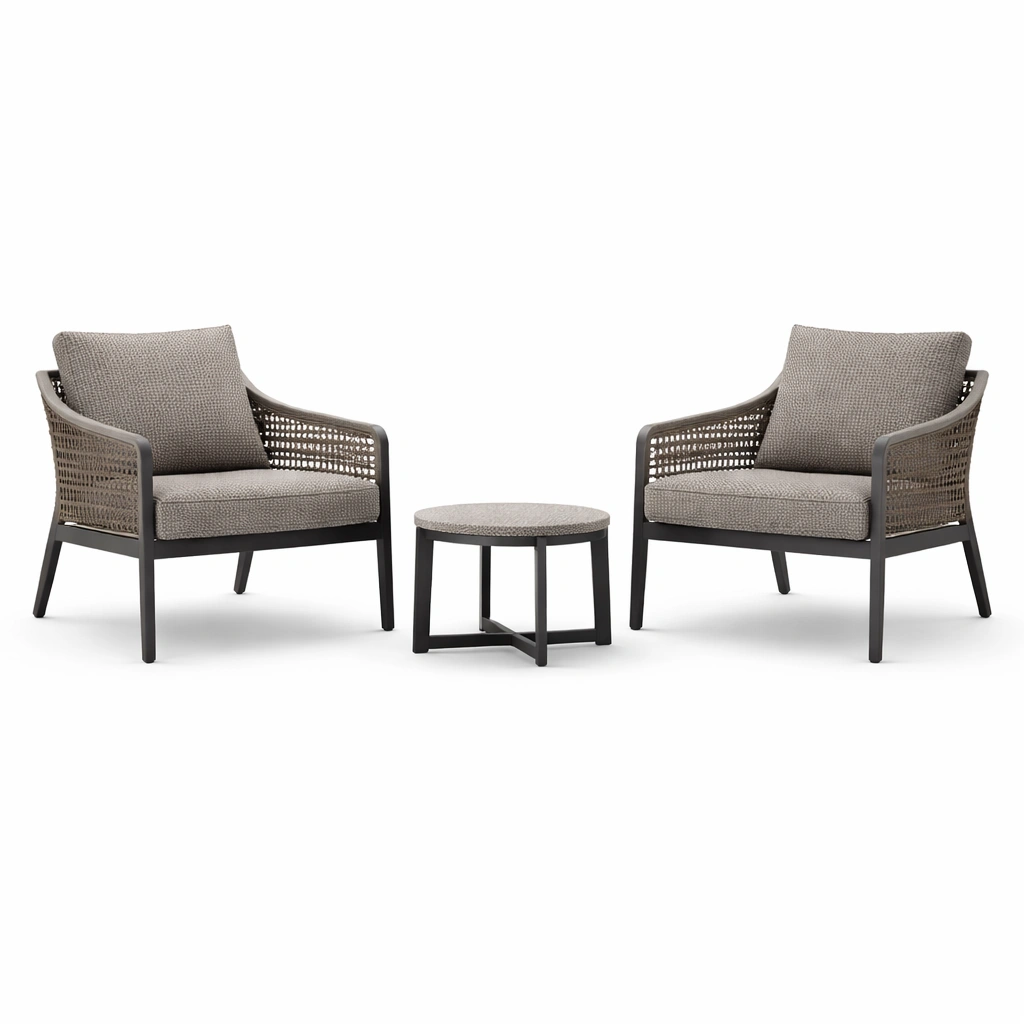 Set da giardino in metallo e tessuto grigio con poltrone e tavolino rotondo
